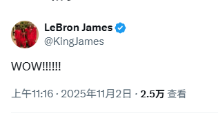 湖人球员勒布朗-詹姆斯发推称赞:“wow!!!”